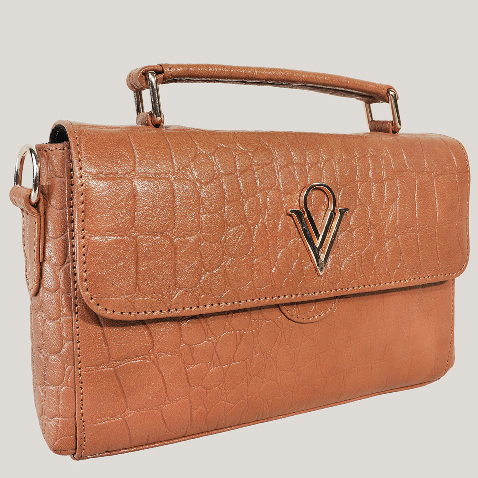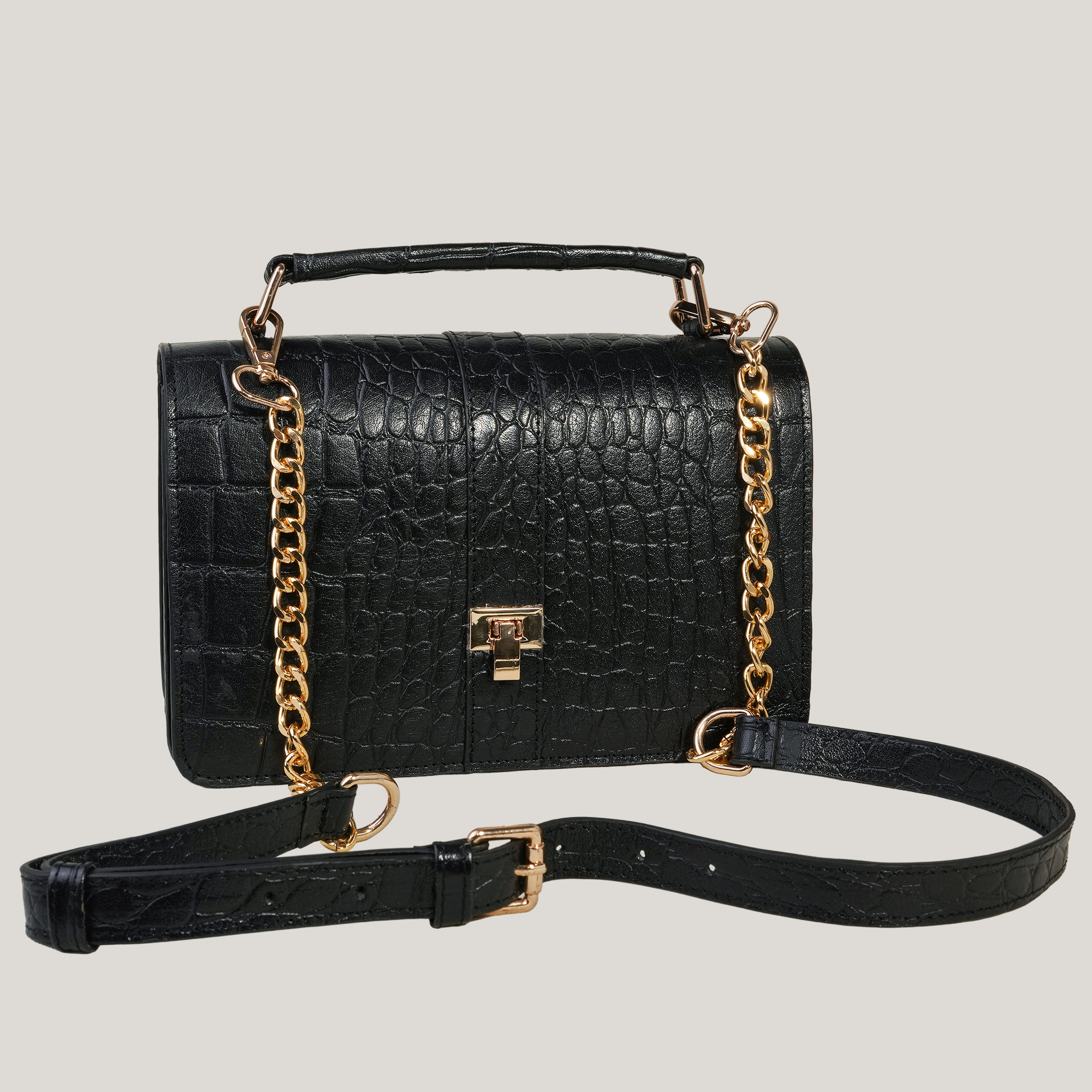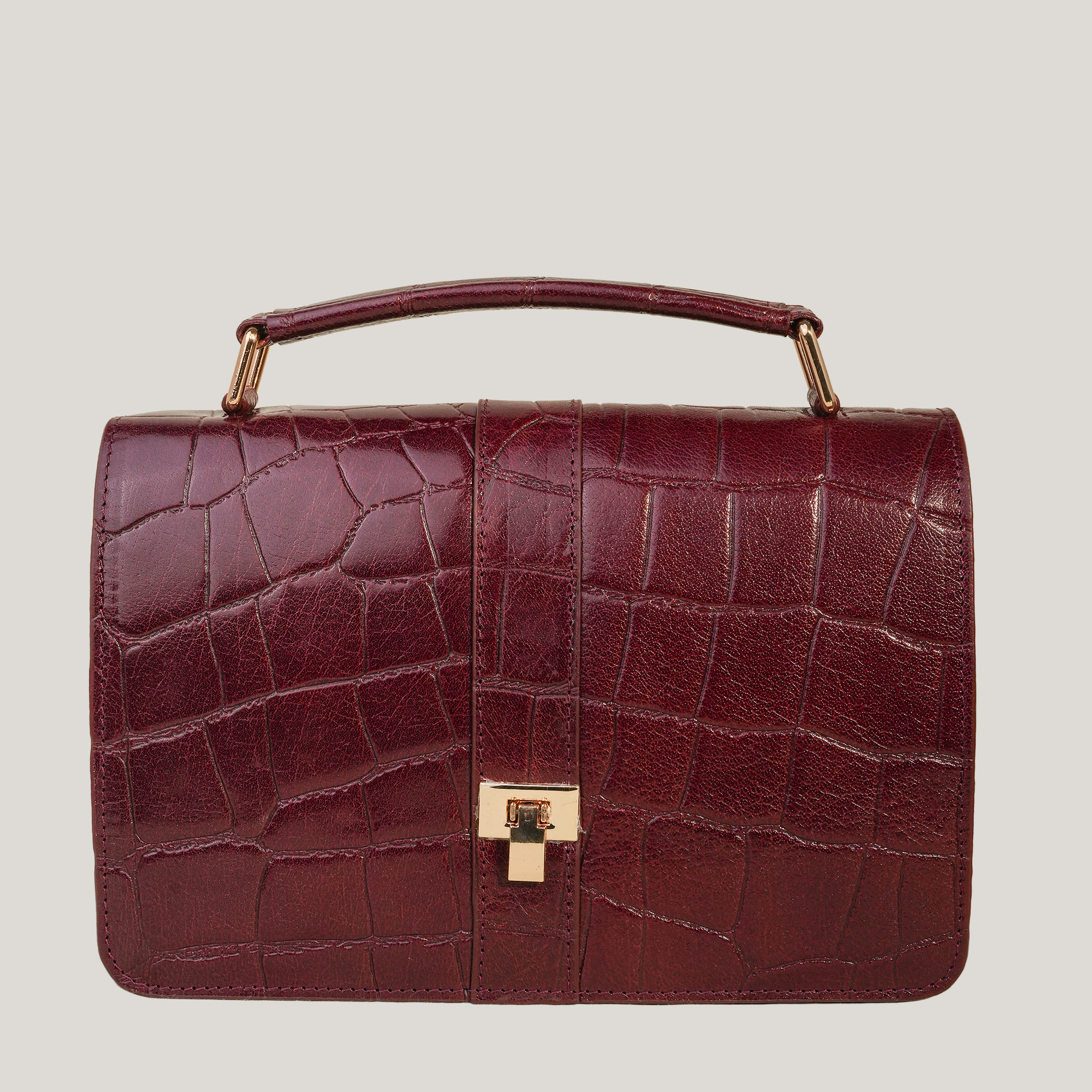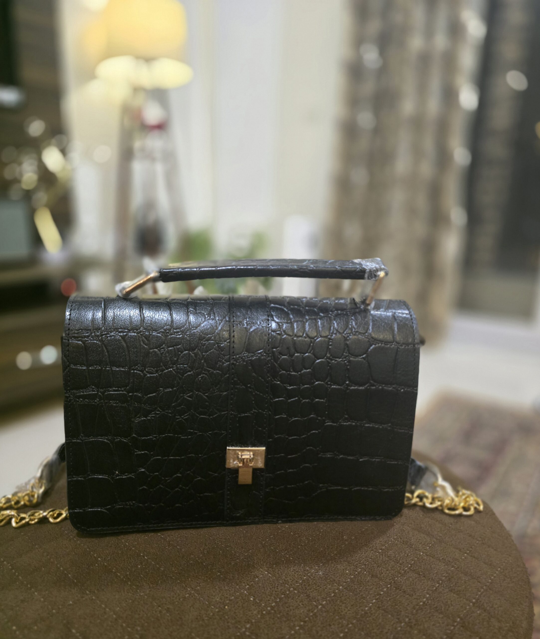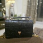 The croc-textured leather and polished twist-lock give it a refined, dressed-up feel, while the compact interior holds exactly what you need: your phone, cards, keys, a small wallet, and your favourite lip colour. No clutter, no extra load, just the comfort of carrying what truly matters.